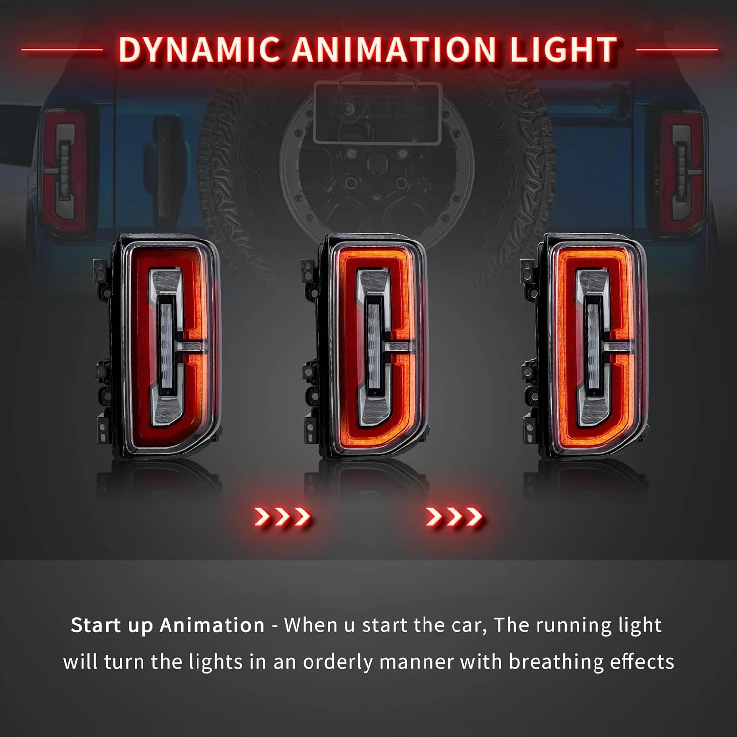 【Design】 Enhance your 2022 Ford Bronco Tail Lights (21-24) with a unique custom style featuring running lights (red with startup animation), brake lights (red), sequential turn signals (amber), and reverse lights (white). These tail lights are superior performance and come with SAE & DOT certification, making sure they are durable and in line with U.S. standards. Made from premium ABS housings as well as PMMA lenses, these lights have the IP67 waterproof rating to ensure reliable use in any weather such as fog, rain and snow. The 2022 Ford Bronco Tail Lights (21-24) provide superior brightness with low power consumption, increasing visibility and driving safety during low-light conditions. They come with Dynamic Start-up Animation as well as modern designs that adds both style and security to your vehicle and make it stand out and improve road visibility.