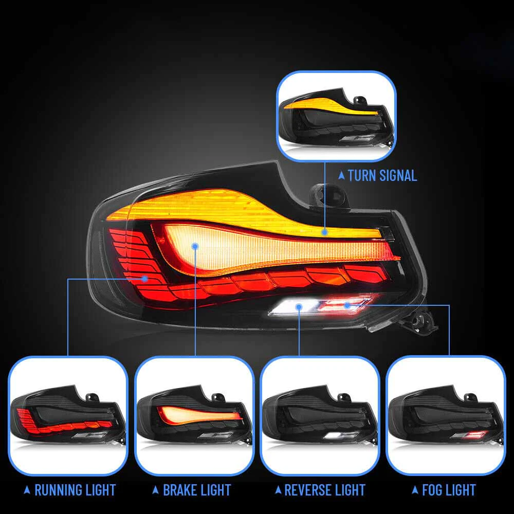 The BMW F22 GTS tail lights offer multiple functions to enhance both the style and safety of your vehicle. The diagram showcases dynamic LED running lights, bright brake lights, and white reverse lights for excellent visibility. The sequential turn signals add a stylish touch, while the fog lights ensure safety in adverse weather conditions.